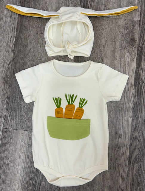 Get your little one hopping in style with our Carrot Bodysuit & Hat Set! This adorable set features a onesie with a playful pocket and a bunny hat to match. Perfect for Easter or any day your little bunny needs a cute and comfy outfit.