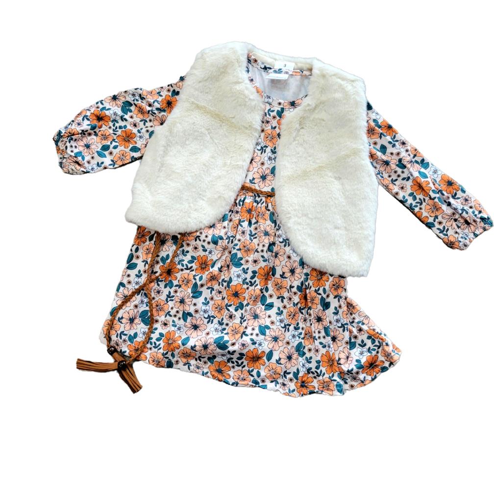 Add a touch of elegance and style to your child's wardrobe with this Floral Dress with Fur Vest and Woven Belt. Order now and let your little one shine this fall season.