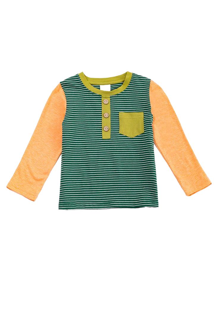 This Forest stripe pocket boy top is perfect for any day of adventure! This stylish top is made of warm, comfortable material with a fun forest-stripe pattern and a convenient pocket. So whether it's a day out exploring the woods or just a day on the go, this top has you covered!