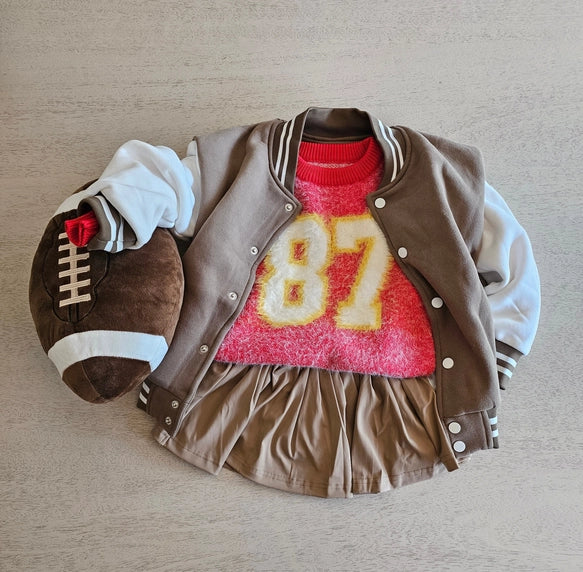 Warm & soft fuzzy red sweater with 87 on it to replicate a jersey.