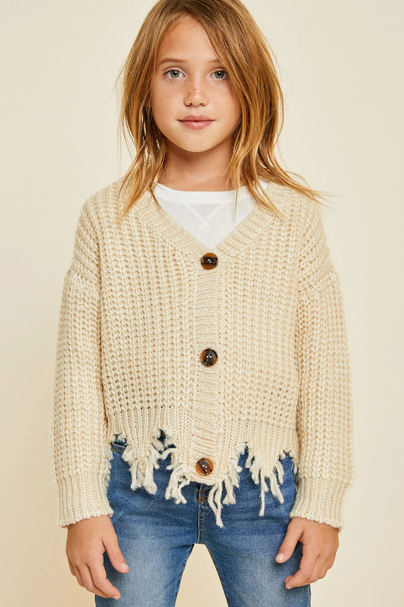 Girls Cream Distressed Hem Button-Down Cropped Cardigan