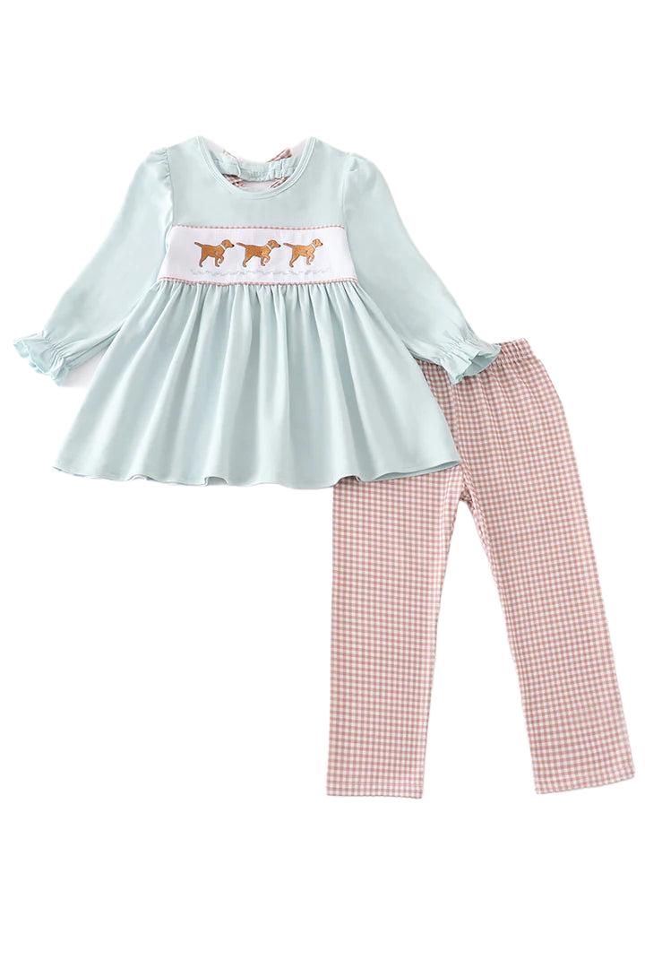 This green dog embroidery girl set is positively perfect for your little one! It includes a comfy t-shirt with an adorable pup embroidered on the front, plus a pair of matching shorts for a complete look that's sure to bring some woof-worthy compliments. Ruff, ruff!