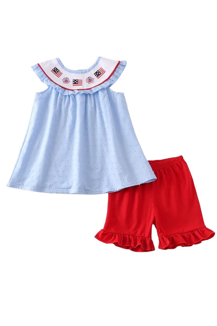 Wrap your little one in playful patriotism with our Blue Patriotic flag embroidery swiss dot girl set. Featuring delicate swiss dot fabric adorned with vibrant flag embroidery, this set is perfect for showing off your love of country while keeping your little girl stylish and comfortable.