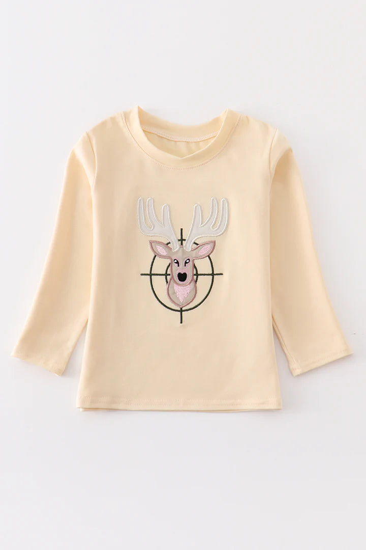 Your little one will look dashing in this beige reindeer applique top. Perfectly suited for festive occasions, he'll be ready to ho-ho-ho in style! It's the perfect choice for any jolly celebration!