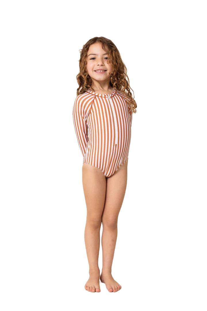 Make a splash in this playful terracotta stripe zip rashguard girl swimsuit. With its stylish stripes and convenient zipper, this swimsuit is perfect for fun in the sun and offers UPF 50+ protection. Stay stylish and protected all summer long!