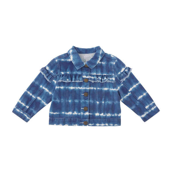 This Tie Dye Toddler Jacket is a must-have accessory for Spring! The canvas jacket features fringe ruffle on the center. The jacket features Mud Pie brass button closures that are fully functional. The jacket features a unique tie dye pattern with bright blue and white patterns.